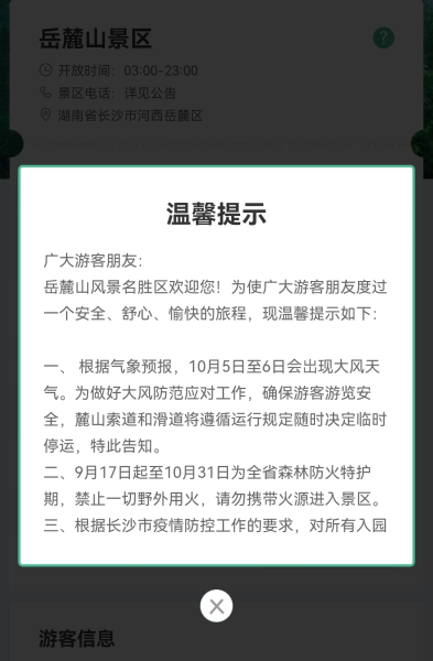 记者查询岳麓山景区预约渠道发现,景区提示:根据气象预报,10月5日至6日会出现大风天气。为做好大风防范应对工作,确保游客游览安全,麓山索道和滑道将遵循运行规定随时决定临时停运,特此告知。