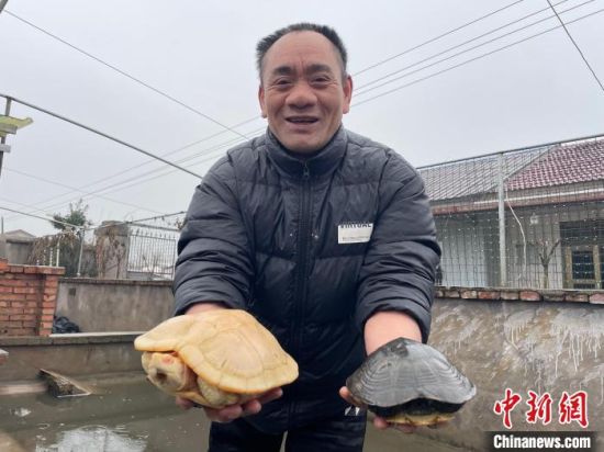 赵国良在基地里展示稀有种龟、种鳖品种。 宋梅 摄