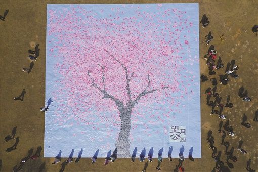 2月27日,长沙望月公园,市民用拼贴画的方式一起创作了一幅约900平方米的巨幅樱花图。当天,该园“早樱新语——2023望月樱花艺旅”活动启幕,让市民在巡游赏花的同时,感受中华优秀传统文化的魅力。