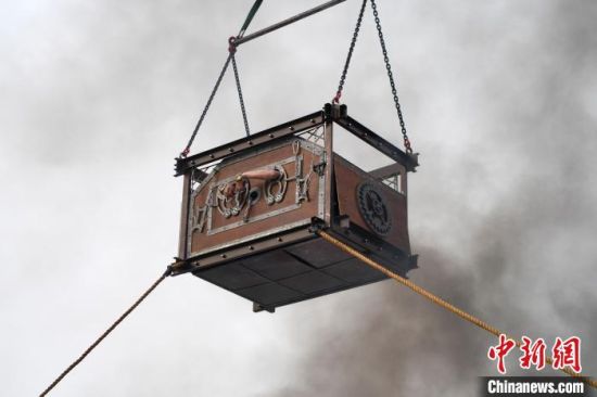 铁箱被吊入空中。 杨华峰 摄