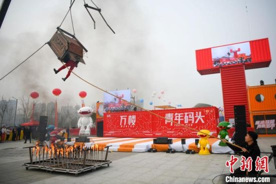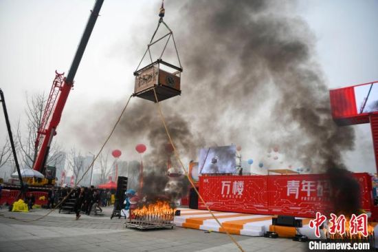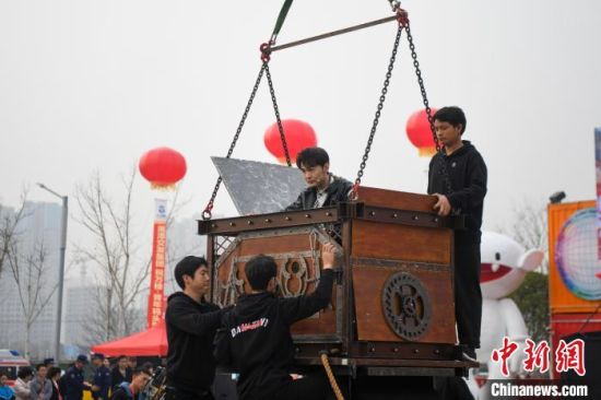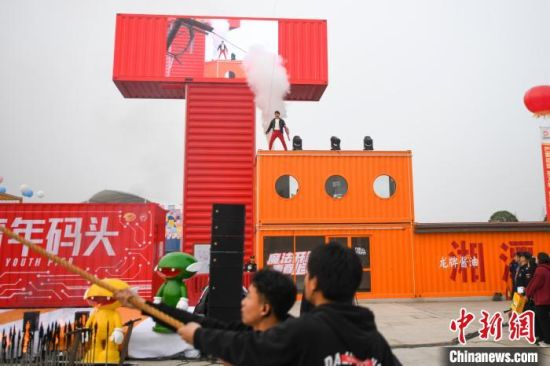 3月3日,魔术师邓男子在湖南湘潭万楼·青年码头集装箱街市上演了一场精彩的极限逃脱魔术。在吊车的辅助下,魔术师邓男子被锁入铁箱吊在空中。铁箱下方摆放燃烧的钢钉,邓男子需在最短时间内成功逃脱,重新亮相在观众面前。