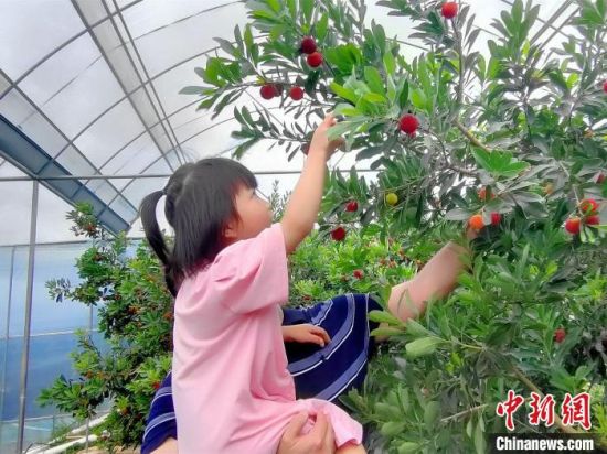 在官团村诚信杨梅专业合作社,杨梅“抢鲜”上市,游客在采摘杨梅。 易子明 摄