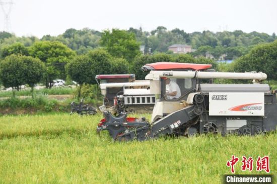 种粮大户姚鹏飞与助手开着收割机收割早稻。 杨华峰 摄