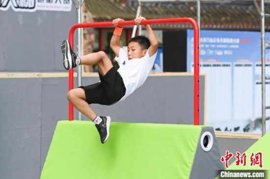 7月23日,第二届张家界天门山“云纵天梯”跑酷大赛少儿组竞速决赛开赛,来自全国40名跑酷小达人齐聚湖南张家界天门山999级“天梯”下竞技,选手们运用规定的技巧动作通过赛道上的各个环节,以最快的速度完成比赛。