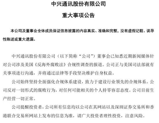 前一日,中兴通讯股价跌停。公司午间披露重大事项称,董事会已知悉近期新闻媒体针对公司涉及美国《反海外腐败法》合规性调查的报道。公司正与美国司法部就有关事项进行沟通,并将通过法律等手段坚决维护自身权益。