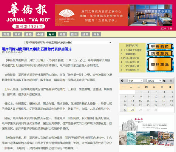 【中新社湖南株洲十月廿七日電】(付敬懿 劉曼)二0二五(乙巳)年海峽兩岸炎帝陵拜謁儀式廿七日在湖南株洲炎陵縣炎帝陵舉行,兩岸各界代表五百餘人參加儀式。