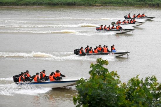 6月3日,武警官兵驾驶冲锋舟进行编队航行。当日,武警湖南总队机动支队在长沙市某水域开展冲锋舟基本操作、定点停船、编队航行、解救和疏散被洪水围困民众等课目集训演练,备战汛期。中新社记者 杨华峰 摄