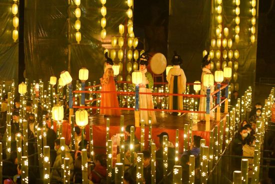 2月13日,众多市民在灯阵中祈福。当晚,一场祈福仪式在长沙世界之窗祈福灯会上演 ,市民们双手合十在星光灯下走起了九曲菩提灯阵祈祷许愿,寓意幸福、健康、节节高升,迎接即将到来的元宵佳节。中新社记者 杨华峰 摄