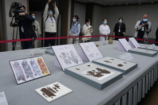 10月13日上午,流失海外79载的长沙子弹库战国帛书第二、三卷《五行令》与《攻守占》正式回归故土、入藏湖南省博物馆。 子弹库战国帛书是迄今为止发现的中国最早的、首个典籍意义上的帛书,于1942年在湖南长沙子弹库楚墓遭盗掘出土,1946年流散海外。通过中美文物返还合作,今年5月18日,美国史密森尼学会国立亚洲艺术博物馆返还的《五行令》《攻守占》落地北京,回到祖国。中新社记者 杨华峰 摄