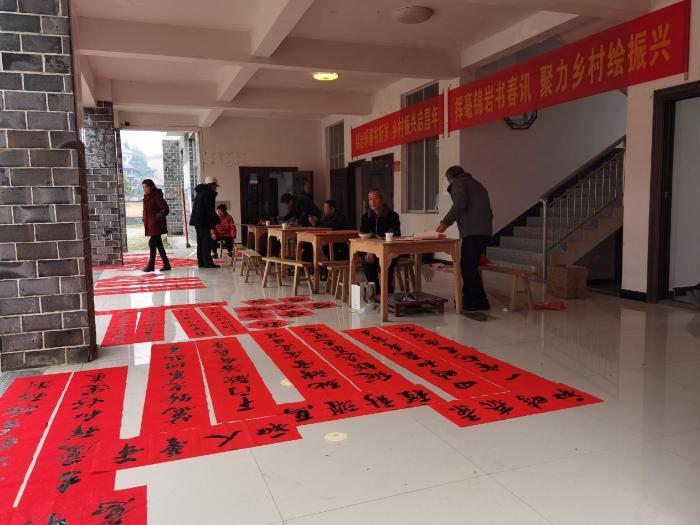 “要一副保佑家人平安健康的。”“我想要一副关于乡村越来越好的春联。”村民们闻讯赶来观赏、品评,主动提出心仪的联语。大家你一言我一语,在欢声笑语中领取墨迹未干的春联。