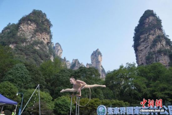 月12日,在湖南张家界举行的2025张家界国际新杂技戏剧周上,来自俄罗斯、德国、智利等国家和地区的演员在峰林中表演杂技,杂技动作与奇峰景观相融合,吸引众多游客围观。图为来自智利的演员表演杂技《踉跄》。中新社记者 杨华峰 摄