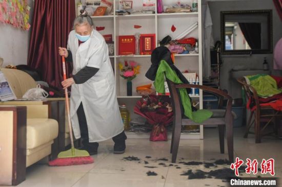 唐金连老人在店内打扫卫生。 杨华峰 摄