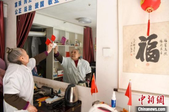 唐金连老人为小区的邻居理发。 杨华峰 摄