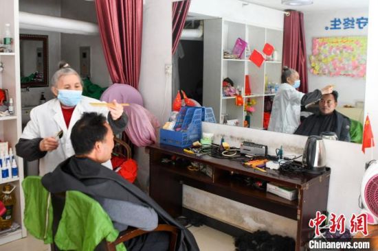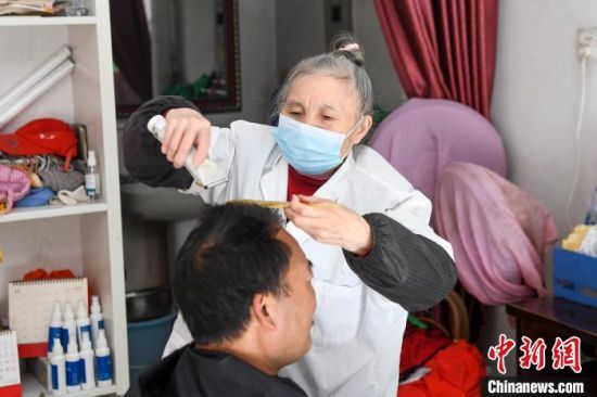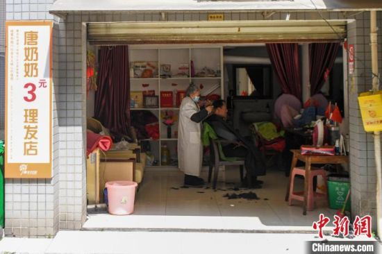 4月8日,71岁的唐金连老人正在为小区邻居理发。唐金连的女儿幼时因脑膜炎致精神失常,一路走来得到很多人帮助。为回报善意,唐金连特意学了理发手艺,在湖南长沙麓谷雅园小区的一个车库里开了一家“唐奶奶3元理发店”。19年来,她坚持理发3元不涨价。
