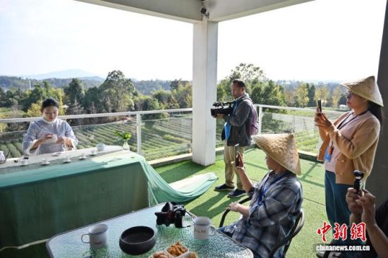图为海外媒体代表前往茶园采茶。中新社记者 杨华峰 摄