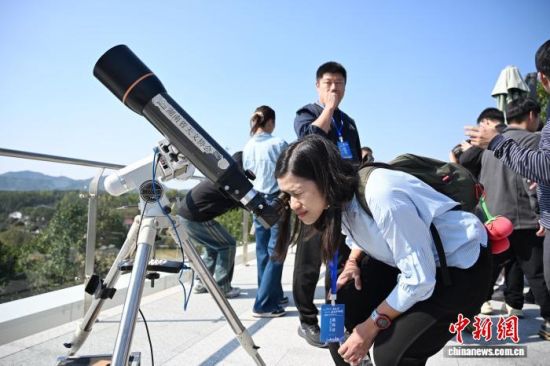 图为海外媒体代表在金井天文台使用望远镜看太阳。中新社记者 杨华峰 摄