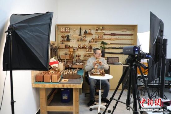 吴绪胜通过直播售卖木质工艺品。蓝山县委宣传部供图