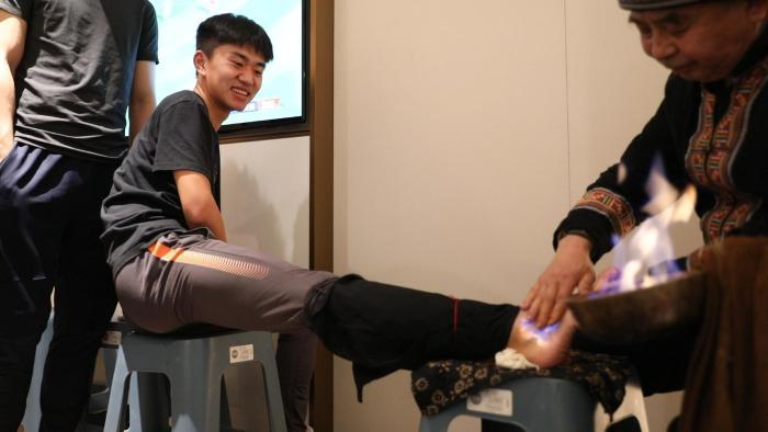 每晚休息时段,瑶医为运动员提供“抓火疗法”“兽骨刮痧”“瑶药足浴”等传统技艺,通过温煦舒筋、药浴调理等方式缓解疲劳,助力恢复状态,被队员们亲切称为“健康助手”。黑龙江队崔雨生、湛江队张衢毅等球员体验后纷纷点赞,直言不适症状明显缓解,山东队应伟杰更是盛赞“江华瑶医就是棒”。