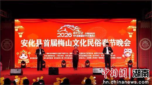 揭牌仪式结束后,安化县首届梅山文化民俗春节联欢晚会精彩启幕。晚会以梅山文化为核心,融入民俗元素与时代气息,节目形式丰富多样、内容精彩纷呈,为现场观众呈现了一场视听盛宴。