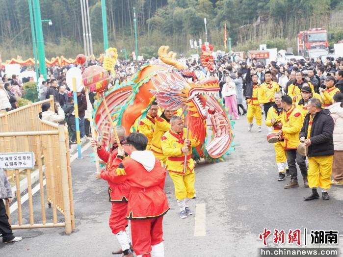 当日下午,在铿锵锣鼓声中,舞龙表演率先开场,30余条色彩斑斓的长龙翻腾起舞,瞬间点燃现场气氛。随后,“一马当先?百龙呈祥?千人巡游”震撼登场,彩龙方阵、古风“桃花美人”、萌趣“元宵宝宝”手捧花灯巡街,笋宝、竹君子、桃仙子等桃江特色IP人偶与民众热情互动。