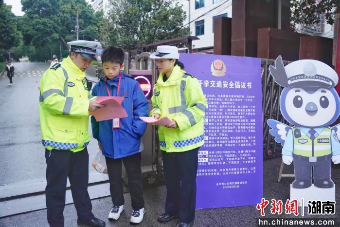 中新网湖南新闻3月5日电 (唐小晴 刘文斌 曾庆屏)3月4日,湖南永州市蓝山县迎来春季开学,为切实做好新学期校园交通安全管理工作,保障广大师生平安返校,蓝山县公安局交通管理大队提前部署、全员上岗,全面开启护学模式,用暖心举措和实际行动为广大师生撑起“平安伞”。