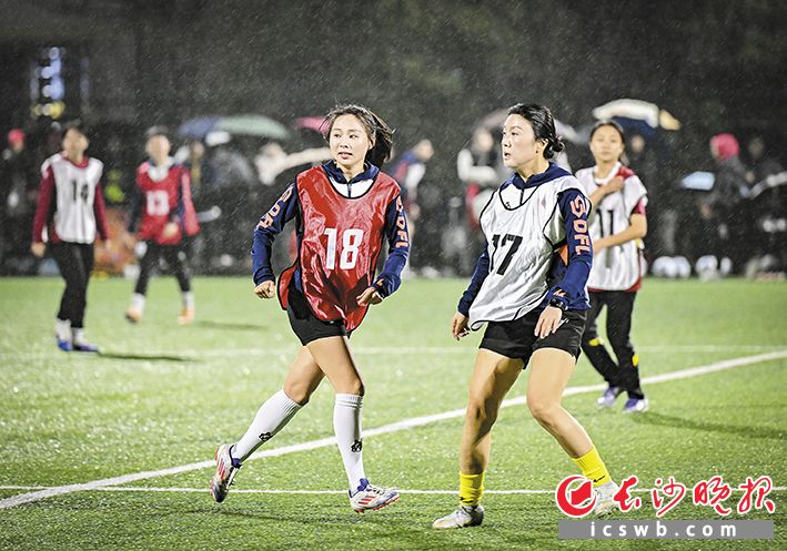 球员们雨中作战。3月23日晚,“湘女超”长沙队在南雅中学足球场进行了首次选拔测试。均为长沙晚报全媒体记者 余劭劼 摄
