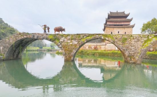 3月24日,江永县夏层铺镇上甘棠村,村民赶着水牛经过步瀛桥。上甘棠村古建筑群是全国重点文物保护单位,有着1200年历史,至今保存着200多幢明清时期的古民居。