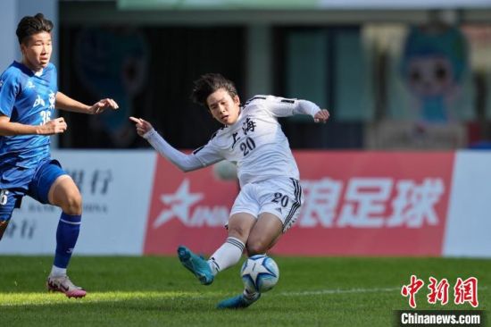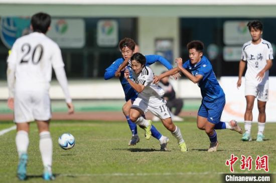 11月27日,第一届全国青少年三大球运动会男子足球决赛在湖南长沙举行,山东队1:0战胜上海队夺得冠军。图为上海队队员刘诚宇射门。中新社记者 杨华峰 摄