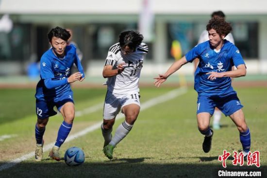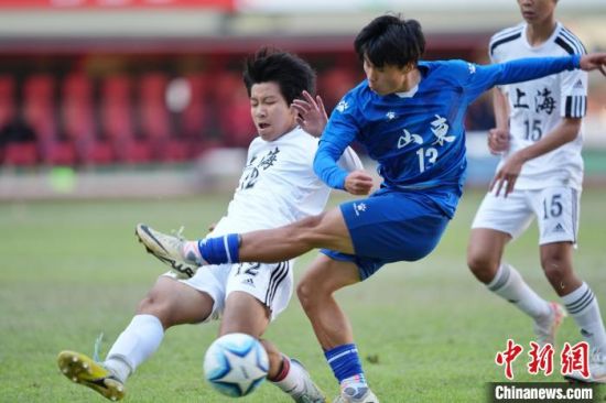 11月27日,第一届全国青少年三大球运动会男子足球决赛在湖南长沙举行,山东队1:0战胜上海队夺得冠军。图为山东队队员徐尧峰(蓝)射门。中新社记者 杨华峰 摄