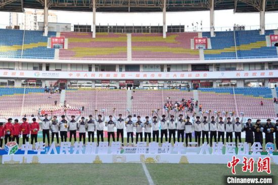 11月27日,第一届全国青少年三大球运动会男子足球决赛在湖南长沙举行,山东队1:0战胜上海队夺得冠军。图为山东队队员登上领奖台庆祝。中新社记者 杨华峰 摄