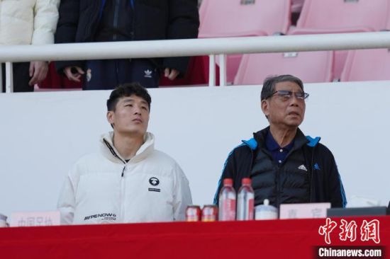 11月27日,第一届全国青少年三大球运动会男子足球决赛在湖南长沙举行,山东队1:0战胜上海队夺得冠军。图为徐根宝与国足运动员武磊(左)现场观赛。中新社记者 杨华峰 摄