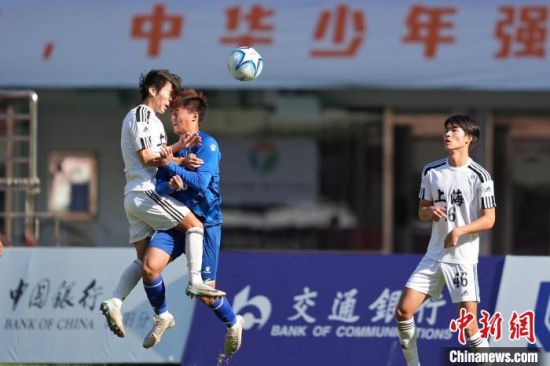 11月27日,第一届全国青少年三大球运动会男子足球决赛在湖南长沙举行,山东队1:0战胜上海队夺得冠军。图为双方队员争抢头球。中新社记者 杨华峰 摄