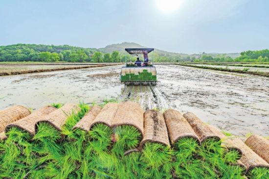 4月14日,东安县白牙市镇大江口村,农机手在田间开展早稻插秧作业。时下,当地农民抢抓晴好天气加快秧苗移栽。今年,该县计划插播早稻26.5万亩,将在4月底前全部完成秧苗移栽。