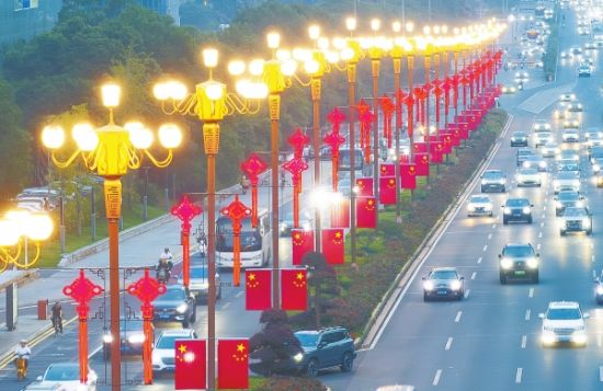 9月30日,长沙市岳麓大道,两旁路灯杆悬挂起了鲜艳的国旗,营造出浓厚的节日喜庆氛围。 湖南日报全媒体记者 辜鹏博 摄