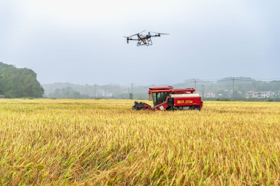 连日来,在湖南永州市东安县鹿马桥镇石坝冲村,农民驾驶联合收割机抢收晚稻。时下,东安县万亩连片高标准农田水稻种植示范基地晚稻陆续成熟,田间地头呈现一派忙碌丰收景象。(唐小晴 蔡小平)