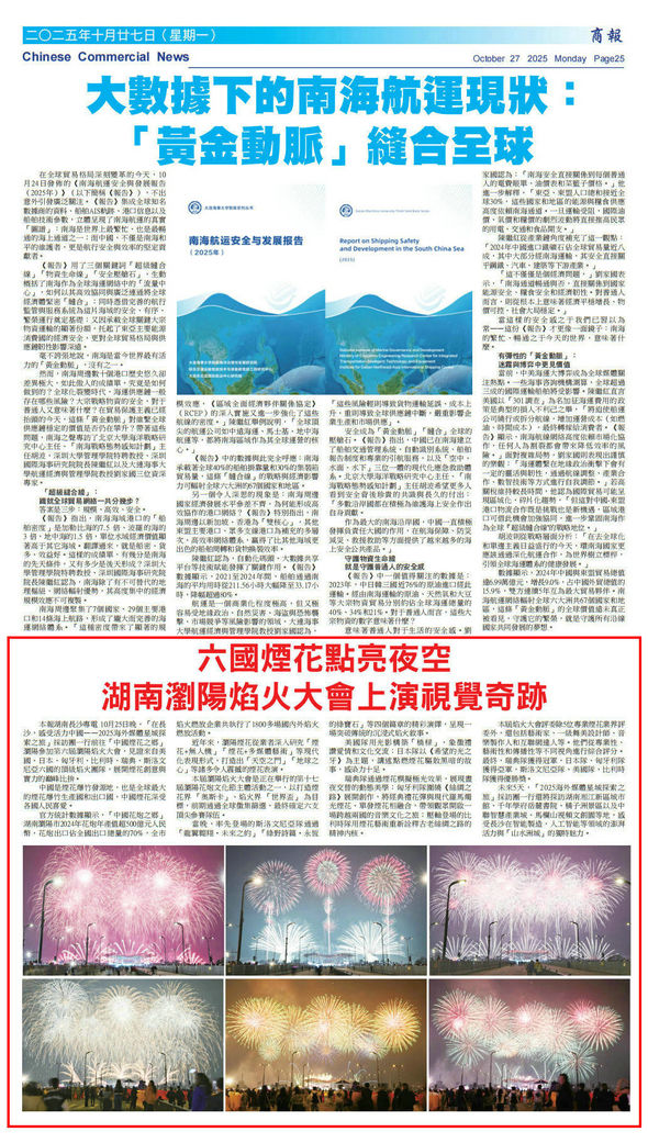 本報湖南長沙專電 10月25日晚,“在長沙,感受活力中國——2025海外媒體星城探索之旅”採訪團一行前往“中國煙花之鄉”瀏陽參加第六屆瀏陽焰火大會,見證來自美國、日本、匈牙利、比利時、瑞典、斯洛文尼亞六國的頂級焰火團隊,展開煙花創意與實力的巔峰比拚。