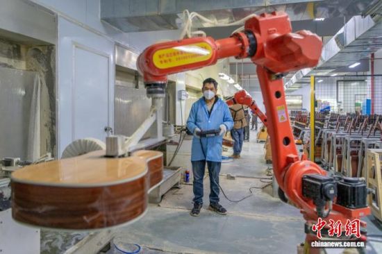 在东安,吉他企业的工人正在操控机械臂打磨吉他。蔡小平 摄