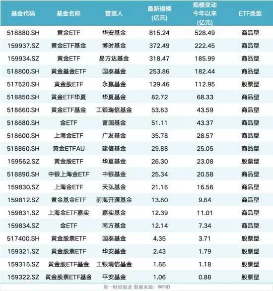 不过,产品间规模分化依然严重。目前,华安黄金ETF(518880.SH)以约815亿元规模稳居榜首,较年初大幅增加了528亿元;博时黄金ETF(159937.SZ)、易方达黄金ETF(159934.SZ)分别以总规模约372亿元、318亿元位列第二、三位,分别较年初增加了222亿元、186亿元左右;国泰、华夏类似产品规模也分别增至254亿元、83亿元。同期,多只黄金ETF规模在15亿元以下。