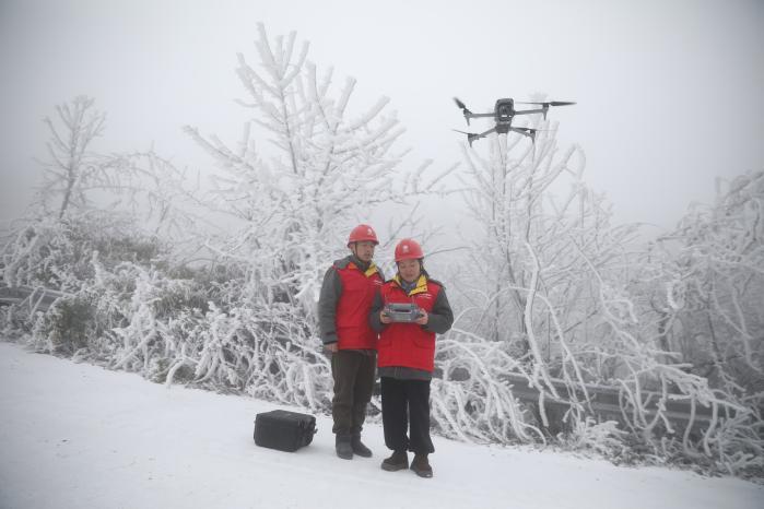 在张家界天子山高寒山区,35千伏武天线41号杆塔附近观冰哨所周围的群山已有积雪。国网张家界供电公司党员服务队队员张富立、覃左臣每天徒步巡线20多公里,入驻观冰哨,实时监视线路覆冰摆动情况,不放过任何隐患,筑牢电网核心枢纽安全防线。