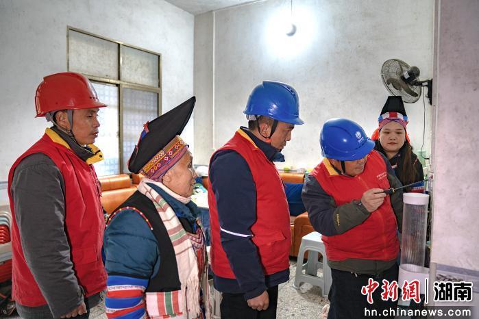 松塔村是塔山瑶族乡地势较高的村寨,山路结冰,越往山上走,气温越低,北风裹着雪粒打在脸上像针扎般疼。在盘冬妹老人的家中,大家搓了搓冻僵的双手便立即动起手来,检查取暖设备、排查线路隐患、更换旧插座……一系列操作娴熟利落。当电暖器重新泛起温暖的红光时,老人用布满皱纹的手紧紧攥住队员,说出了心里的感谢。
