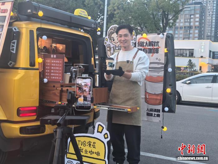 傍晚时分,湖南长沙月湖公园里,一辆移动咖啡车前飘出醇厚香气。47岁的香港艺人姚亦澧熟练地操作着咖啡机,将一杯贴着“加薪美式”标签的咖啡递给客人,用日渐流利的普通话热情招呼:“慢慢喝,欢迎常来!”