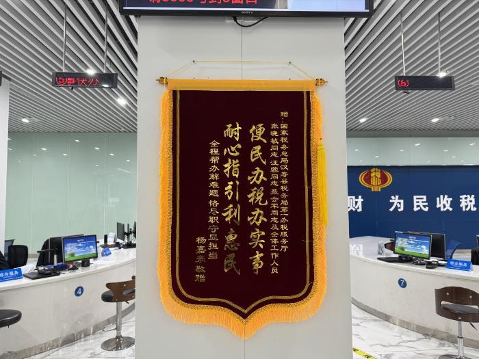 近日,纳税人杨先生将一面写有“便民办税办实事 耐心指引利惠民”的锦旗和一封表扬信,专程送至常德市汉寿县第一税务所(办税服务厅)“简事快办”窗口,对税务窗口工作人员高效解决其企业社保缴费难题表示感谢。