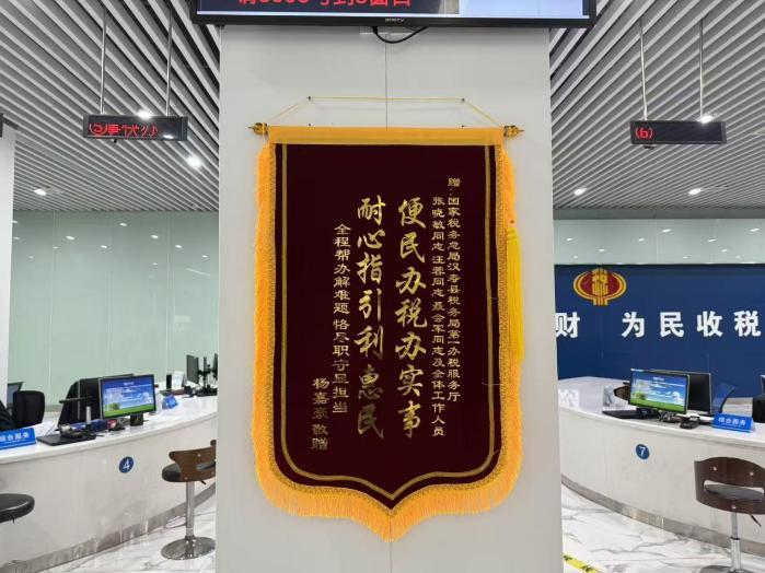 近日,常德市汉寿县纳税人杨先生专程将一面印有“便民办税办实事 耐心指引利惠民”的锦旗与手写表扬信,送到汉寿县税务局第一税务所“简事快办”窗口,对窗口工作人员高效解决其企业社保缴费难题表达感谢。