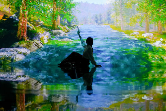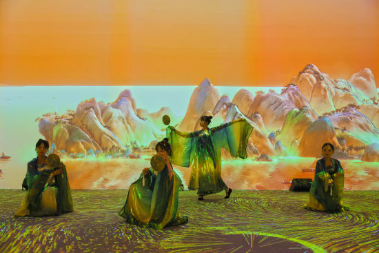 舞者在 “千里江山奇幻游” 数字光影展前翩翩起舞。董媛丽 摄