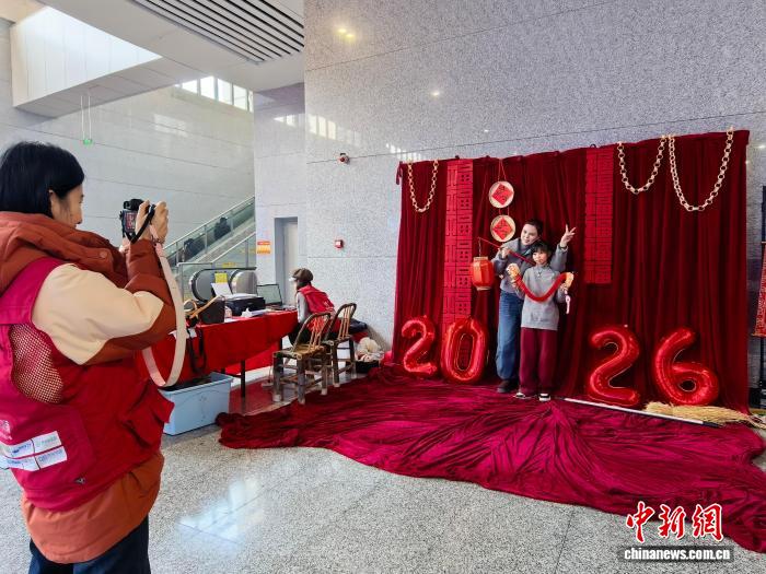 中新网邵阳2月15日电 (记者 刘双双)14日下午,湖南邵阳高铁站出口,人潮涌动。出站口一侧,一间临时搭起的“时光照相馆”格外惹眼——大红的背景布上悬挂着一长串福字剪纸,两侧摆放着灯笼、马上有福、锦鲤等拍照道具。
