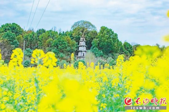 望城区茶亭镇的近8000亩油菜花田生机盎然,每年吸引了不少游人前往观赏。远远望去,油菜花一大片一大片地睡在惜字塔下的田里。偶尔一阵微风吹来,便涌起了高低起伏的“金色花浪”。
