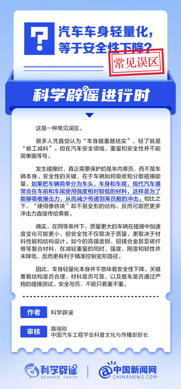 中新网3月19日电 很多人凭直觉认为“车身越重越结实”,轻了就是“偷工减料”。但在汽车安全领域,重量和安全性并不能简单画等号。车身轻量化本身并不意味着安全性下降。安全与否,关键要看结构是否合理、材料是否可靠,以及整车是否通过严格的碰撞测试。(来源:@科学辟谣 中国新闻网微博)