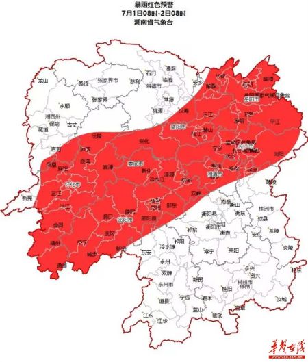 湖南省气象台7月1日06时发布暴雨红色预警:预计1日08时至2日08时,长沙、湘潭、邵阳、岳阳、益阳、怀化、娄底、湘西州东南部部分地区将出现暴雨,部分地区大暴雨,局地特大暴雨,并伴有短时强降水、雷雨大风等强对流天气,请加强防范。