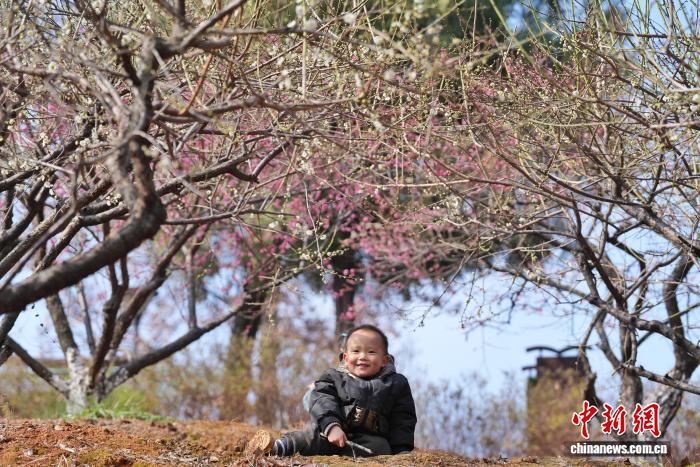 1月23日,长沙气温回升,湖南省植物园梅花绽放,市民来到梅林邂逅冬日里难得的阳光与温暖。图为小朋友在梅林中嬉戏。中新社记者 杨华峰 摄