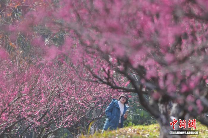 1月23日,长沙气温回升,湖南省植物园梅花绽放,市民来到梅林邂逅冬日里难得的阳光与温暖。图为游客在梅林中赏花。中新社记者 杨华峰 摄